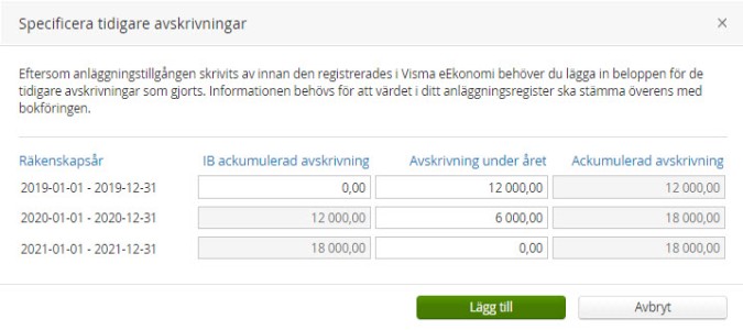 Du har en anläggningstillgång som du har specificerat tidigare avskrivningar för, enligt följande: