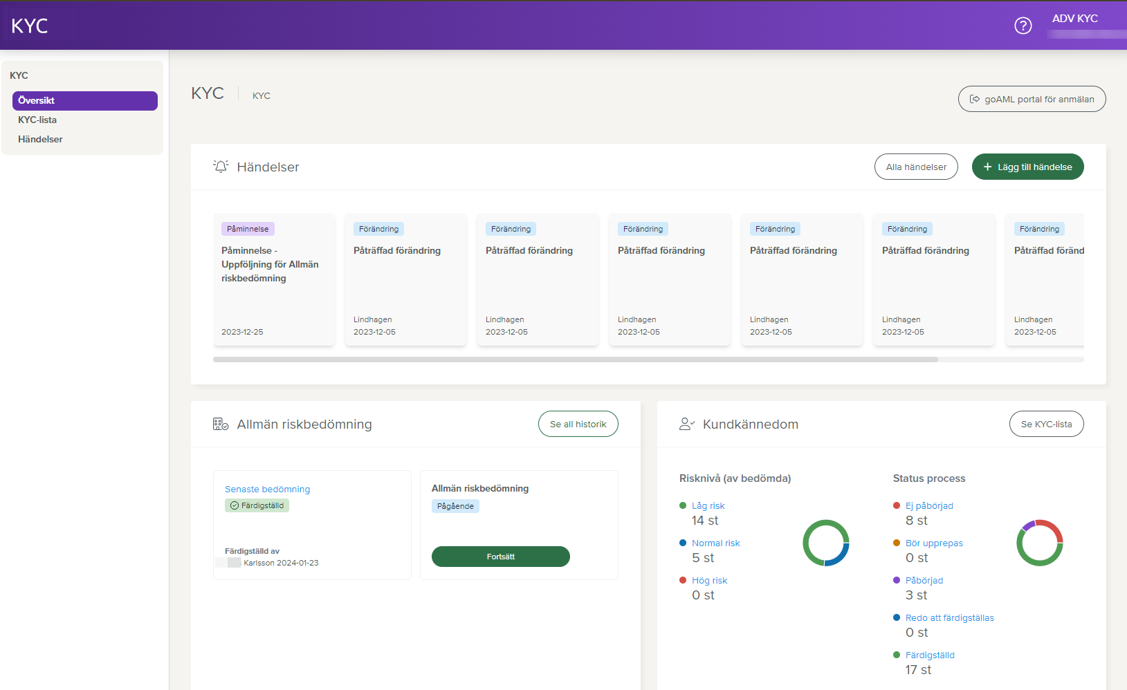 Händelser är samlingsnamnet för alla viktiga händelser som rör din byrås allmänna riskbedömning och KYC-rapporter. En del händelser skapas automatiskt, andra är påminnelse om att det är dags att utföra en ny allmän riskbedömning eller KYC-rapport. Du kan alltid lägga till egna händelser. De sju senaste registrerade händelserna visas i Översikten, antingen på Översikten på fliken KYC, eller i Översikten när du öppnar KYC.