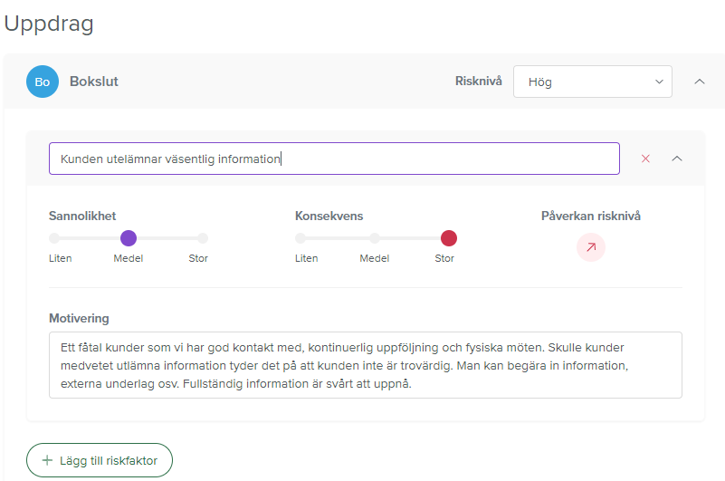 Om du arbetar med uppdrag, kommer dessa att synkroniseras automatiskt från Byråstöd. Du behöver komplettera uppdragen med en bedömning av riskfaktor och en övergripande risknivå.