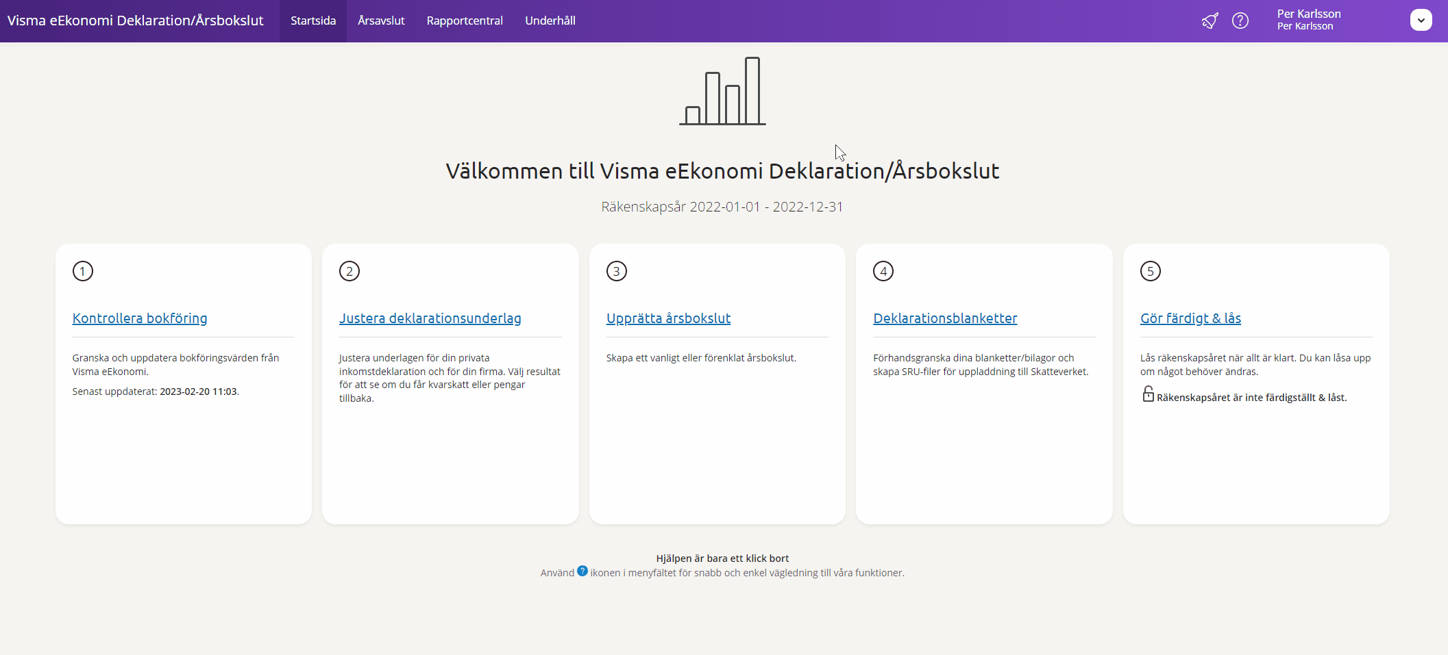 Sidan 1 fylls i automatiskt med uppgifter hämtade från Årsavslut - Kontrollera bokföring.