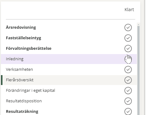 När ett dokument är färdigifylld klarmarkerar du den genom att klicka på bocken i kolumnen Klart i vyn till vänster. Klarmarkeringen kommer att markeras med ditt namn och en tidsstämpel och det går inte längre att göra några ändringar