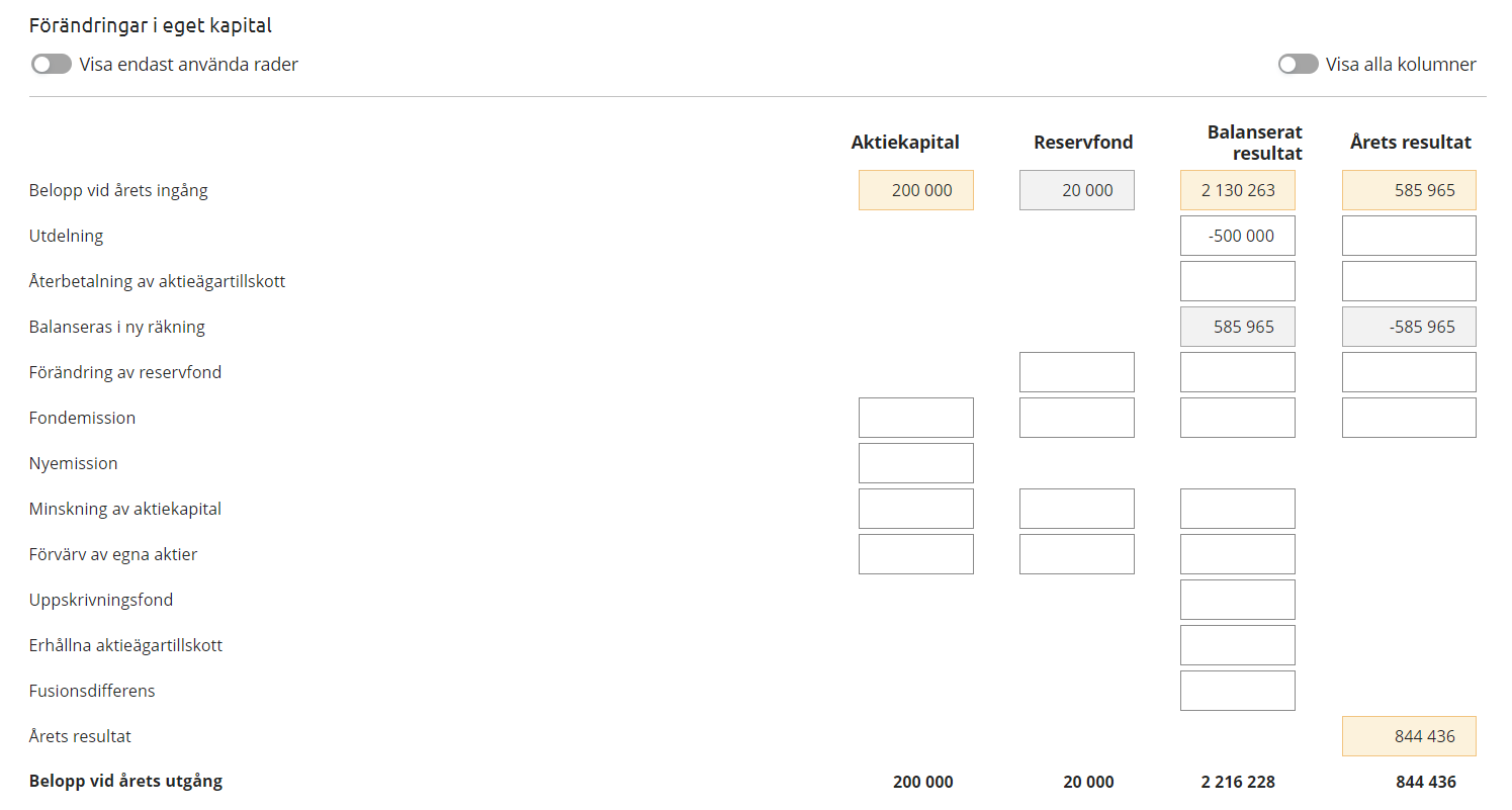 Under Årsavslut - - Förändringar i eget kapital ska du ange de förändringar av det egna kapitalet som skett jämfört med föregående års balansräkning. Vanliga exempel på förändringar är årets resultat, omföring av föregående års resultat och utdelning.