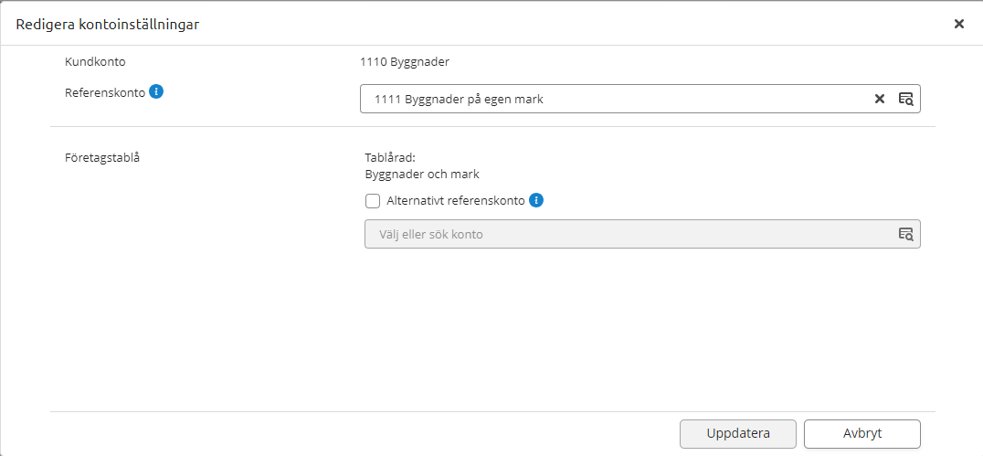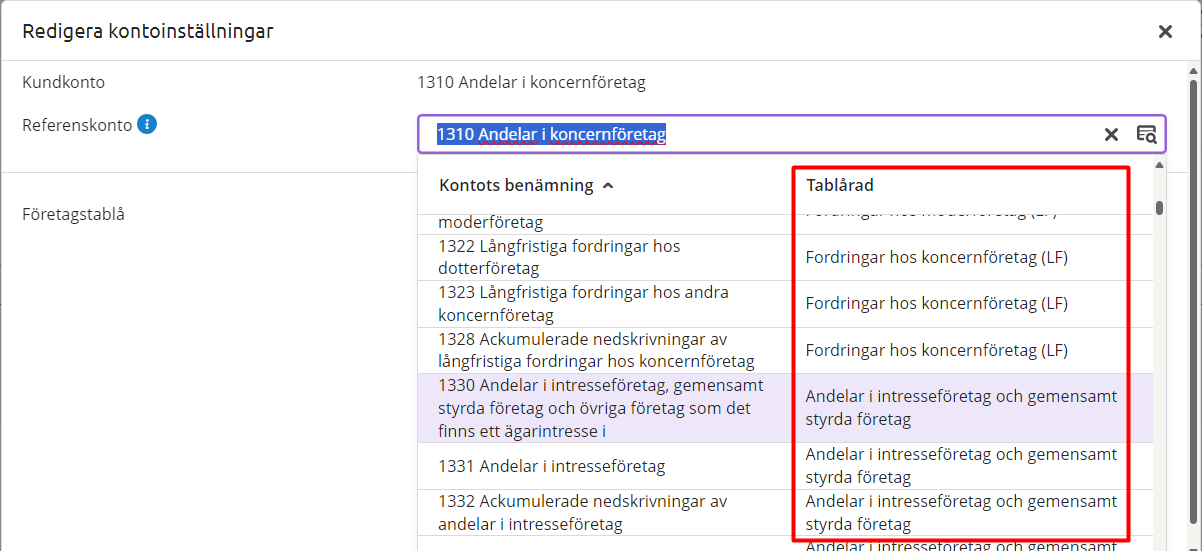 Vid importen kopplas alla företagets konton automatiskt till ett referenskonto i Koncernredovisning, som i sin tur styr dess placering under rätt tablårad i företagstablån. Genom att byta referenskonto kan du få kontot att hamna på en annan tablårad.
