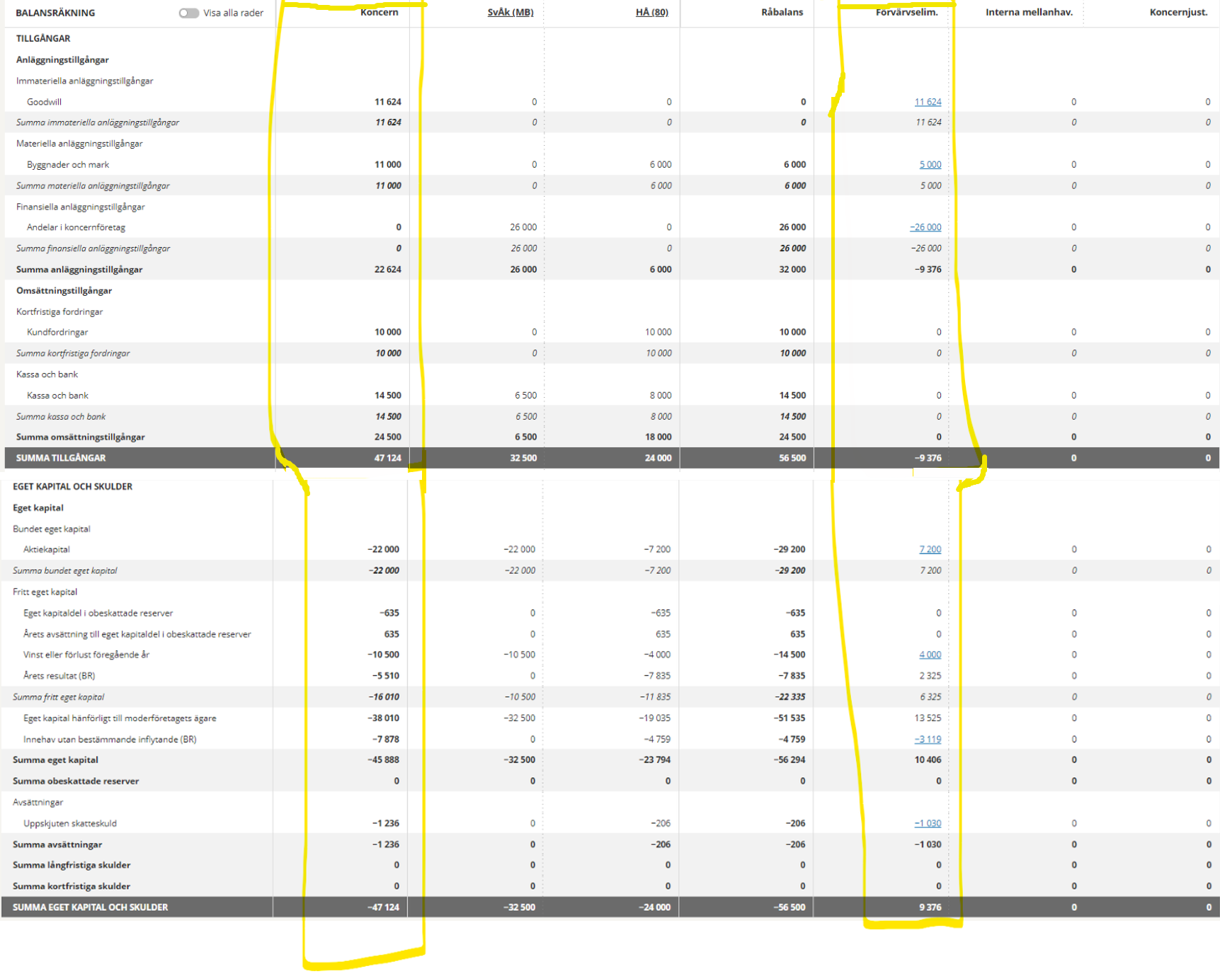 I koncerntablån förs beloppen över från förvärvselimineringsverifikationen till kolumnen Förvärvseliminering. Dessa elimineringar gör att balansräkningen nu redovisar tillgångar, skulder och eget kapital som om koncernen vore ett företag.
