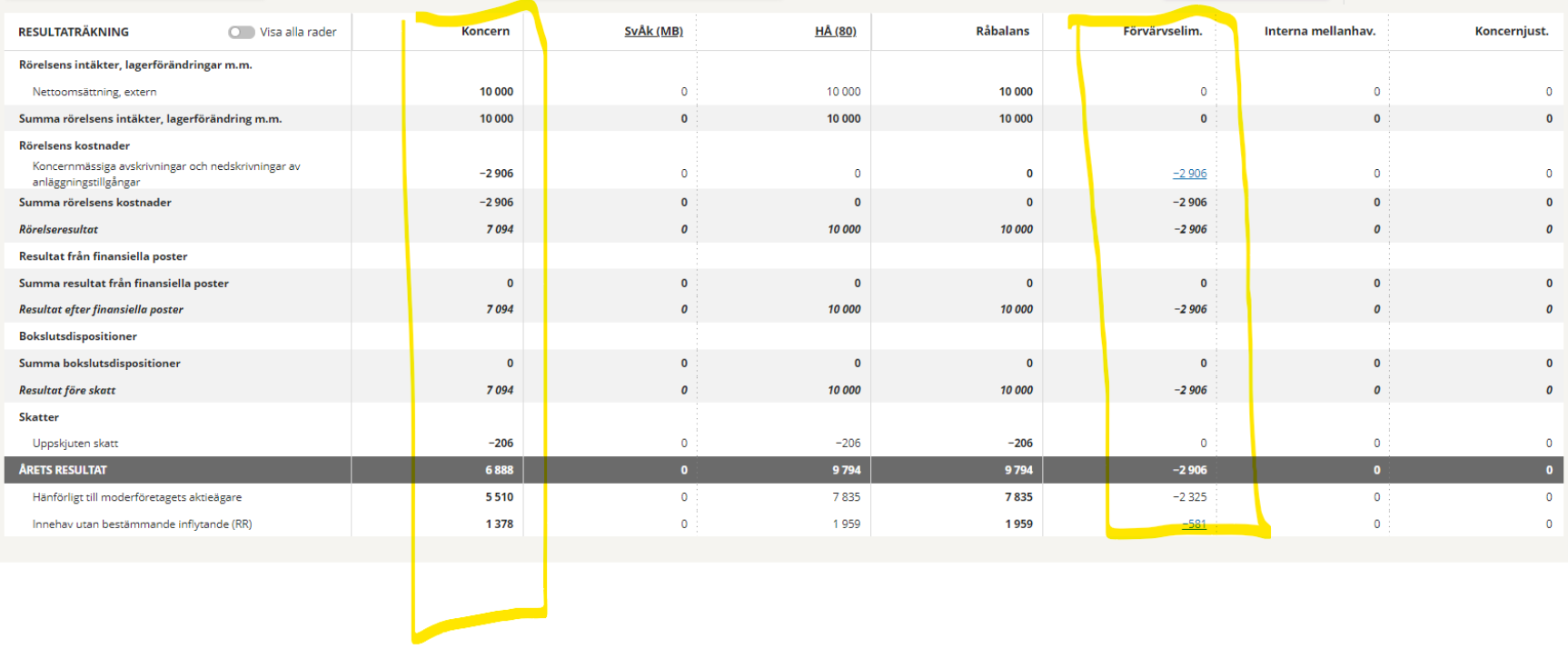 - I kolumnen Förvärvselimiering visas de elimineringar som dokumenteras på verifikationen Förvärvseliminering (delägda). Här framgår avskrivningen vi gjorde på goodwill, men också hur kostnaden för avskrivning av goodwill fördelas mellan minoriteten och moderföretaget.