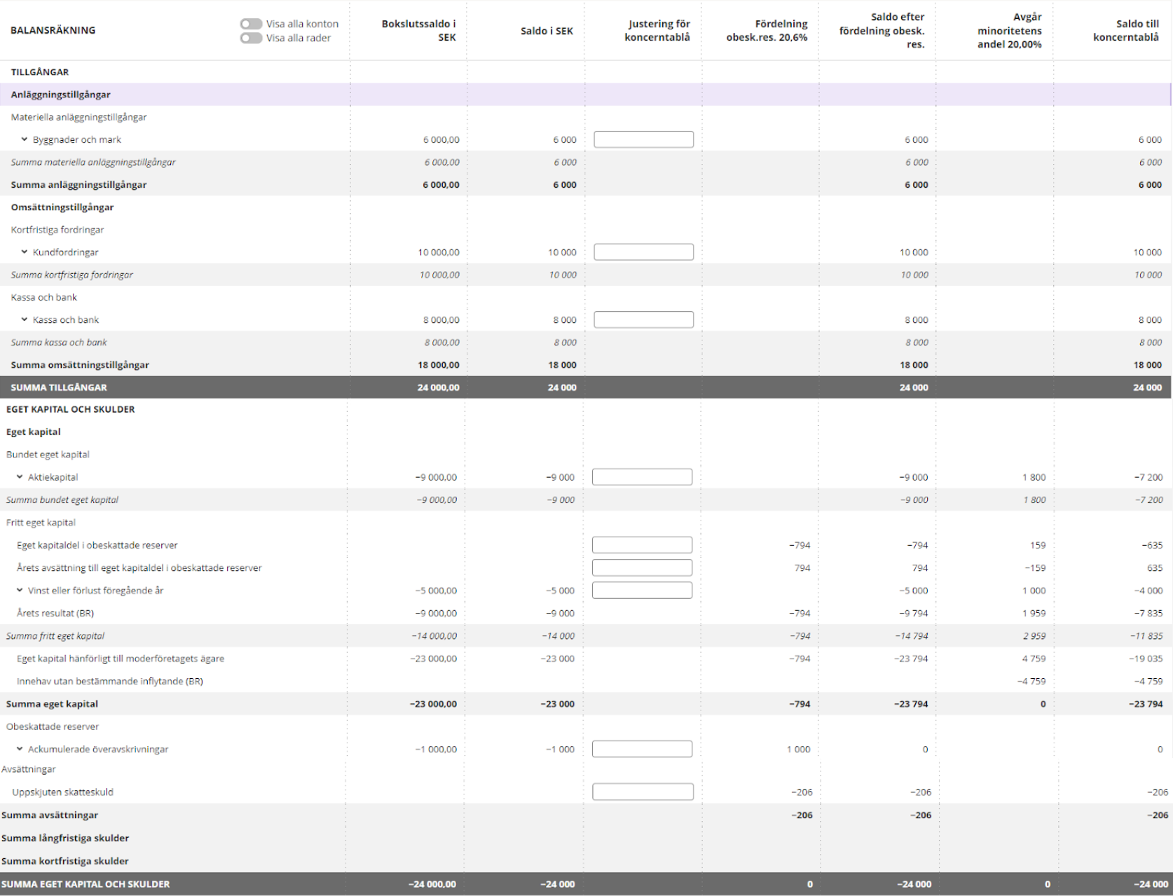 Den del av eget kapital som ägs av minoriteten beräknas och visas alltså på raden Innehav utan bestämmande inflytande (BS) och förs över till dotterföretagets kolumn i koncerntablån. I koncerntablån via koncernverifikationen Förvärvseliminering gör du sedan de justeringar som avser över-/undervärden, uppskjuten skatt och goodwill. Minoritetens andel av detta räknas ut och uppdaterar raden Innehav utan bestämmande inflytande (BS) på verifikationen som sedan uppdaterar koncerntablån.