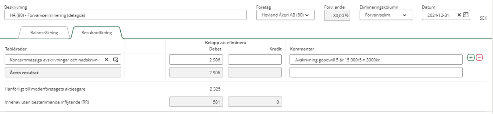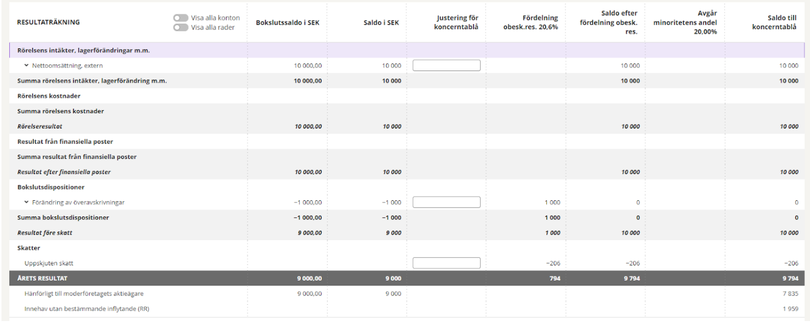 Den andel av årets resultatpåverkan som tillhör minoriteten, 581, förs över till balanssidan och läggs på raden Årets resultat men ombokas automatiskt mot Innehav utan bestämmande inflytande (BR). Dessa bokningar innebär att de justeringar som gjorts på verifikationen, och som får en påverkan på Årets resultat i balansräkningen endast visar moderföretagets andel av årets resultat medan den del av resultatet som tillhör minoriteten ligger på raden Innehav utan bestämmande inflytande (BR).