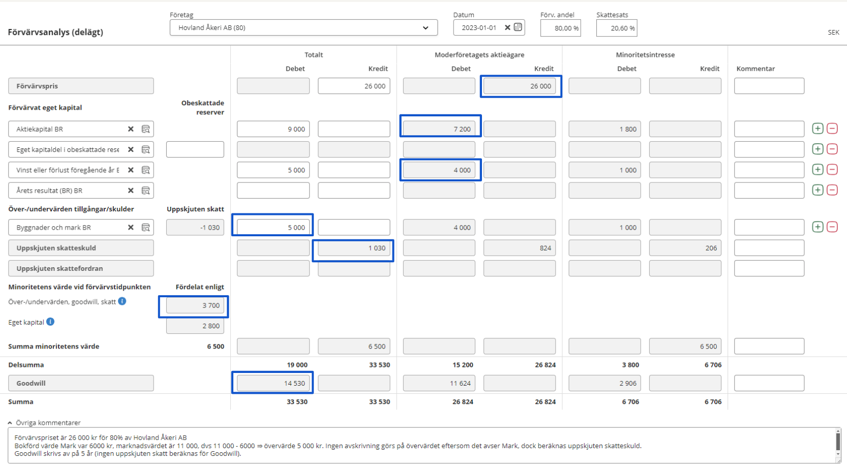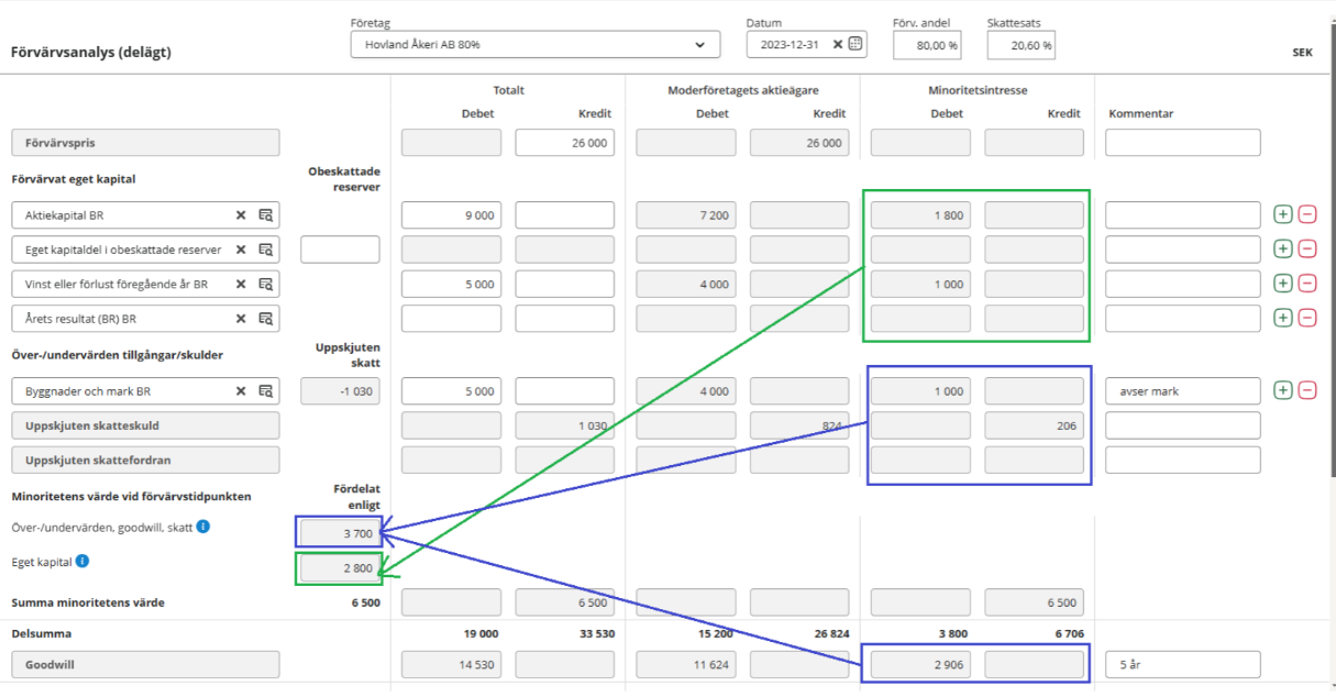 Identifierade övervärdet för mark 5 000 anges till sitt fulla värde och den tillhörande uppskjuten skatt beräknas automatiskt. Hur mycket av dessa värden som tillhör moderföretaget respektive minoritetsintresset räknas ut.