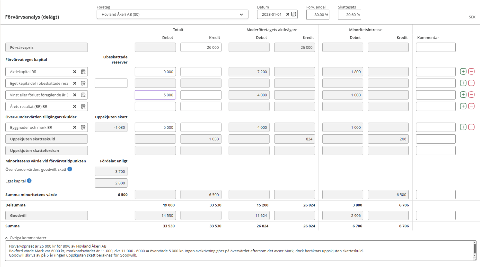 I förvärvsanalysen anges förvärvspriset för de förvärvade andelarna och det totala egna kapitalet som fastställts vid förvärvstidpunkten. Eventuell goodwill och eventuella över-/undervärden anges till totala värden enligt enhetssynen. Minoritetens respektive majoritetens andelar av dessa räknas ut automatiskt.