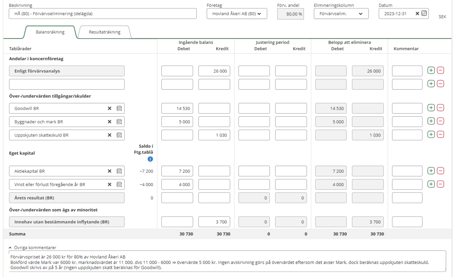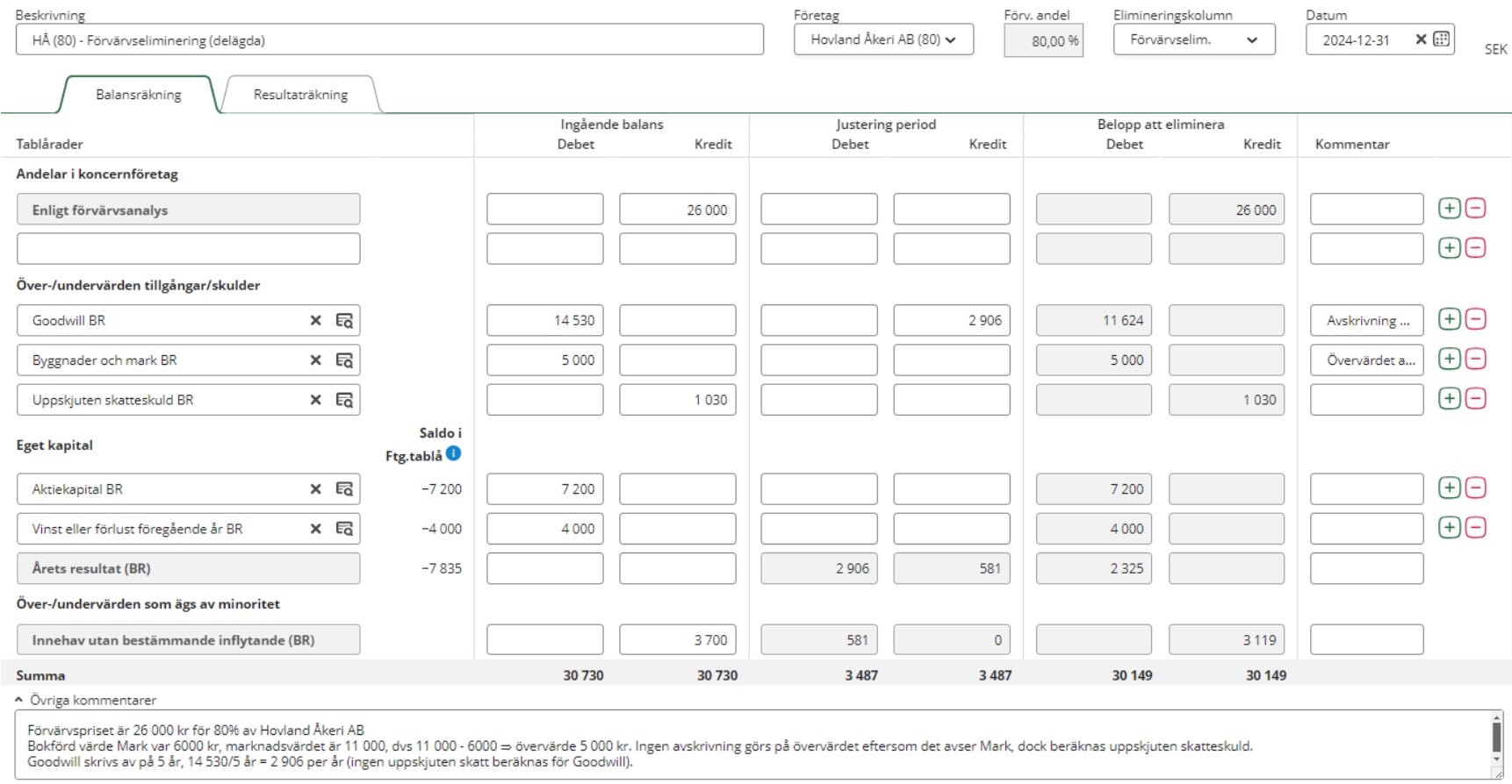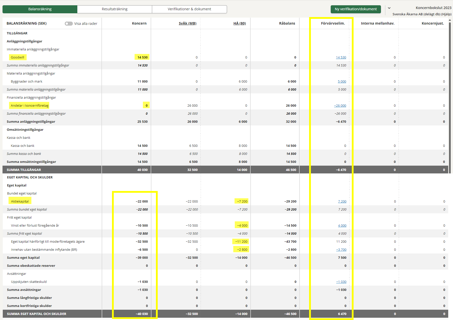På förvärvselimineringsverifikationen tas även goodwill, övervärden och eventuell uppskjuten skatt upp som identifierades vid förvärvstidpunkten. Genom att hantera detta på verifikationen görs korrekta justeringar av koncernens resultat- och balansräkning.