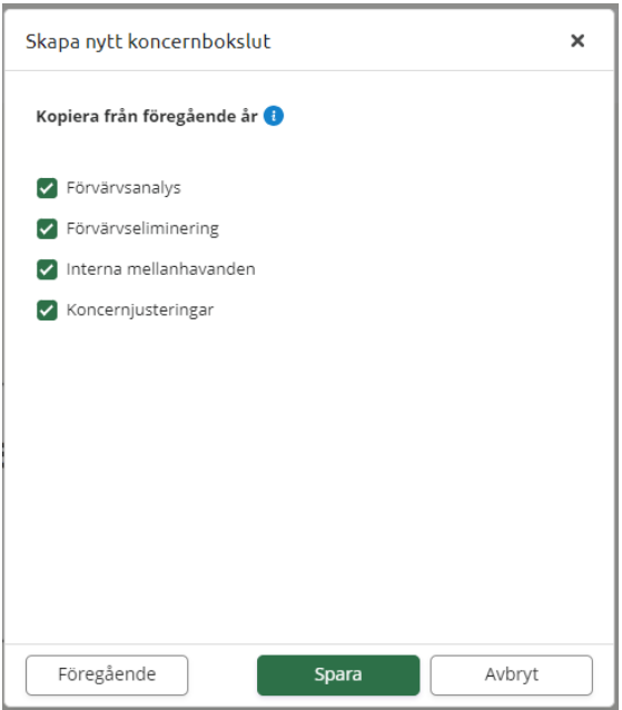 När du väljer att skapa nytt koncernbokslut för 2024 kan du på steg 2 i guiden välja att kopiera dokument och koncernverifikationer från föregående år: