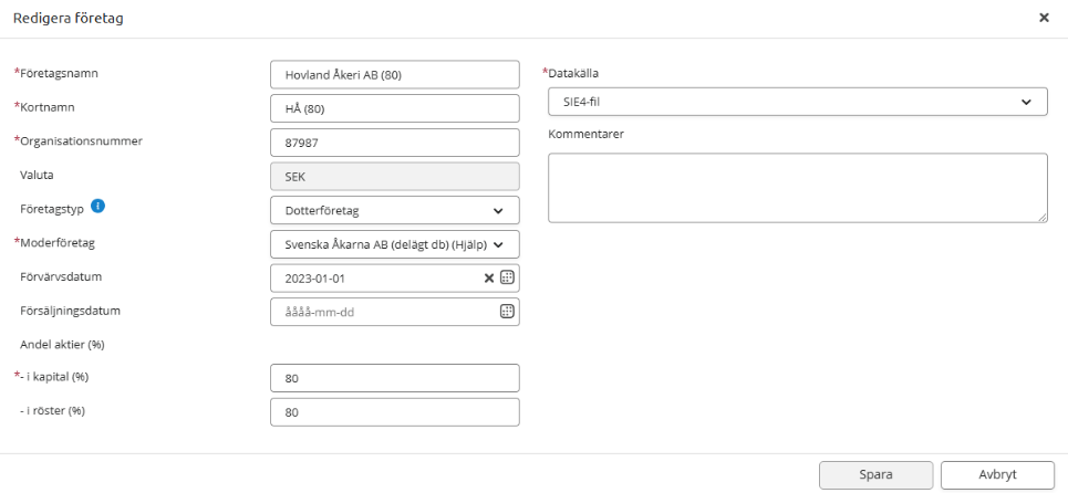 Uppgifterna från förvärvet matas in på Förvärvsanalysen (delägda). När dotterföretaget väljs in hämtas förvärsdatum och ägd andel av kapital från koncernstrukturen. Det ser då ut enligt bilden nedan: