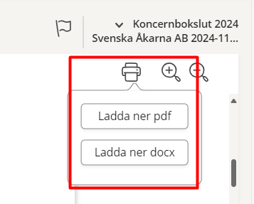- Spara ner årsredovisningen genom att välja antingen Ladda ner pdf eller Ladda ner docx under skrivarikonen uppe till höger.