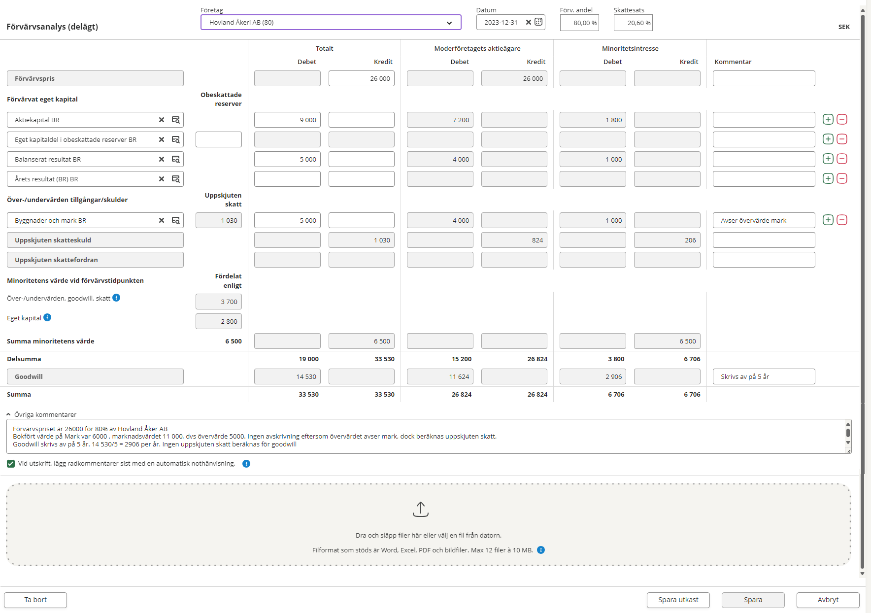 Har du ett dotterföretag där det under året förvärvades exempelvis 60%, men innan årets slut förvärvats resterande 40%, så ligger bolaget i koncernstrukturen med ägarandelen 100%. Dock ska förvärvsanalysen upprättas då förvärvet skedde. Förvärvad andel får då manuellt ändras till 60% på förvärvsanalysen. |