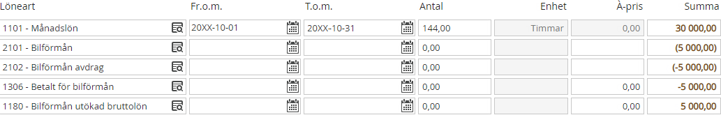 - Ange det belopp som ska dras för bilförmånen från den anställdes nettolön.