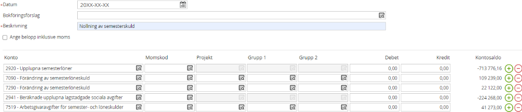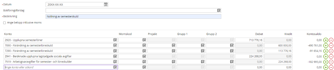 Om du har bokat upp semesterskuld i ditt företag under flera år, kommer dina 7XXX-konton efter nollställningen att ta med kostnaden för hela semesterskulden, vilket kan visa negativa saldon. Det justeras när du bokför nästa lönekörning med den automatiska uppbokningen, så att saldot istället visar kostnaden för årets semesterskuld.