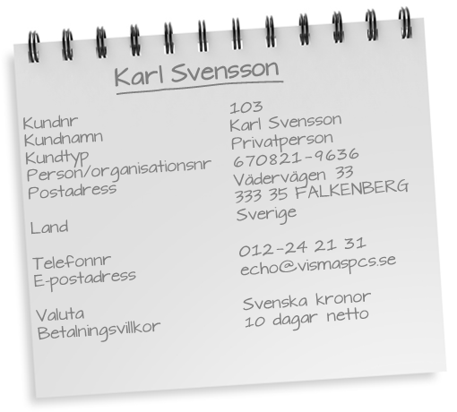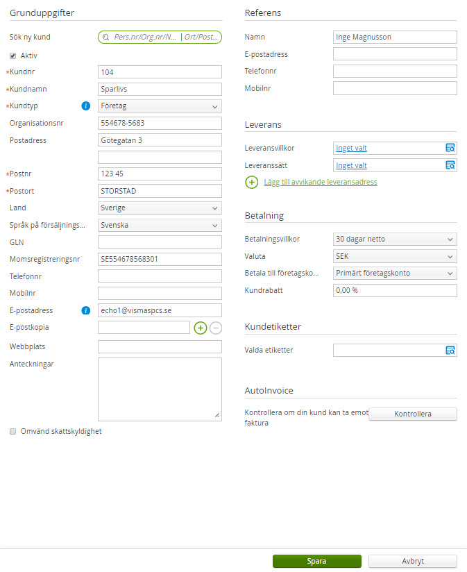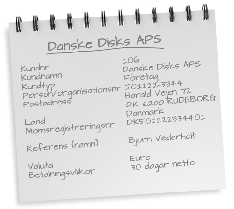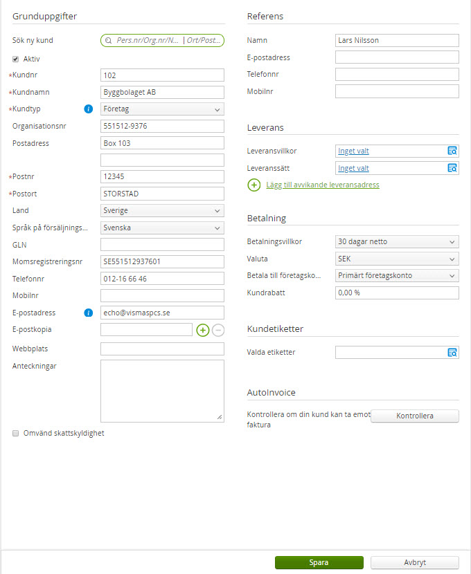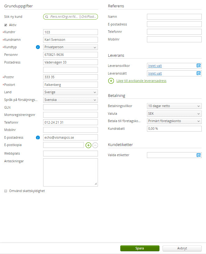 Grunduppgifterna för repektive kund ska vara registrerade enligt följande. När kunden är en privatperson anges normalt ingen Referens.