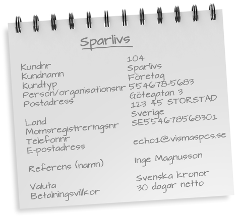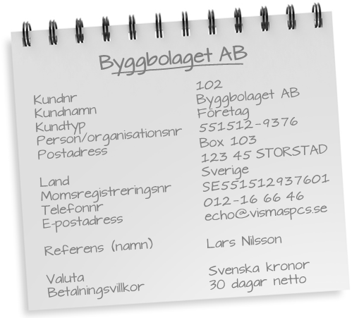 - Underlagen innehåller enbart uppgifter som är nödvändiga för att kundfakturor ska kunna skapas. Beroende på vilken verksamhet ditt företag har kan fler fält vara nödvändiga att använda.
