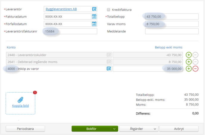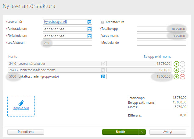 • När du anger Fakturadatum räknas Förfallodatum ut utifrån det Betalningsvillkor, som du angav när du registrerade leverantören. Du kan ändra Förfallodatum direkt på fakturan om du vill.