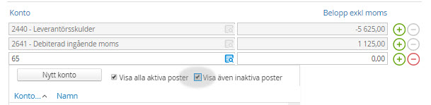 • Alla bokföringskonton är inte aktiva från början. För vissa underlag behöver du därför markera Visa även aktiva poster och/eller Visa även inaktiva poster när du anger bokföringskonto.