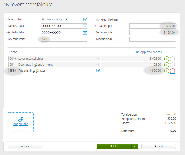 • När du valt Bokför kan du inte längre ändra alla uppgifter på leverantörsfakturan. När du öppnar verifikationen kan du ta bort rader, ändra kostnadskonto. ändra förfallo- samt fakturadatum. Övriga fält är låsta för redigering.