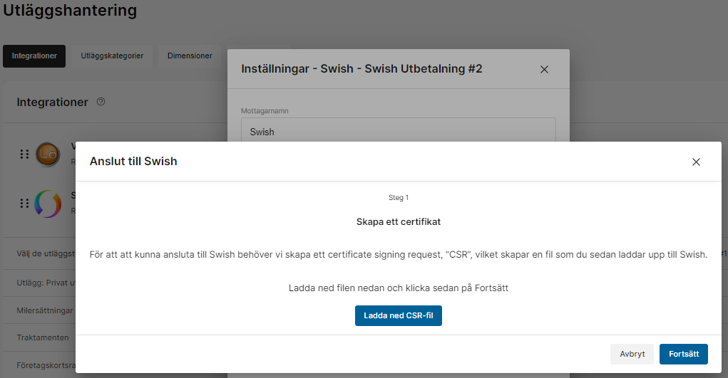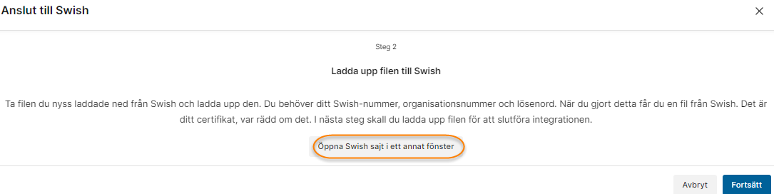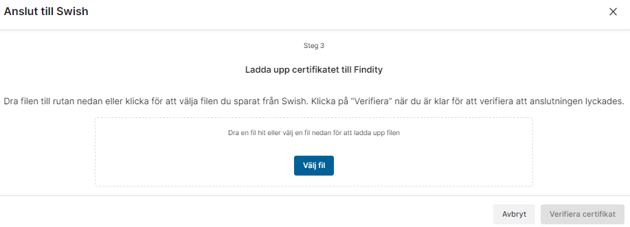 - Klicka på Fortsätt och ladda upp PEM-filen/certifikatet som du fått från Swish.