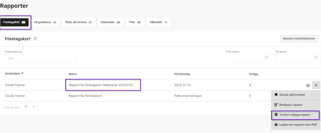 Ta bort rapporter för företagskort