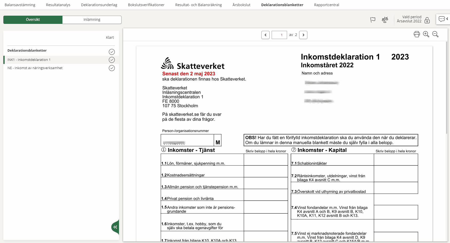 Tax & Annual accounts handles Skatteverket's submission method Inkomstdeklaration 2 - Lämna. All tax forms belonging to Tax return INK2 can be submitted via this service. This applies to INK2, INK2R, INK2S, N3B, N4, N7, N8 and N9. In other words, you do not need to use the old file transfer service (sru) for Tax return INK2.