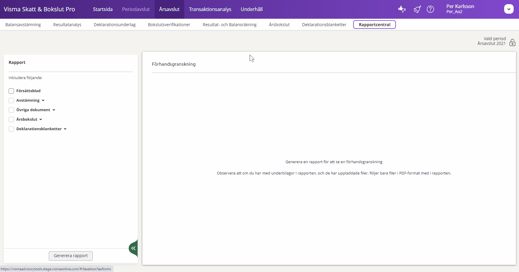 Det går också utmärkt att använda Rapportcentralen. Där kan du skriva ut flera blanketter samtidigt. Easy peasy - välj bara blanketterna som du vill skriva ut från menyn till vänster, klicka sedan på Skapa rapport och därefter Ladda ner pdf.