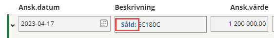 När en anläggningstillgång säljs eller utrangeras registrerar du det genom att klicka på den blå ikonen till höger om den aktuella raden. Om du anger försäljningspriset räknas den eventuella vinsten eller förlusten fram. Två nya kontorader läggs till och bilagan kan kopplas till ett resultatkonto - vinst vid avyttring eller förlust vid avyttring. När en anläggningstillgång säljs eller utrangeras kommer dess rad gråas ut och texten Såld eller Utrangerad visas i fältet Beskrivning.