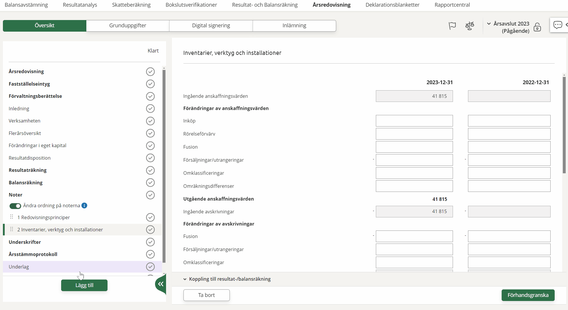 Noterna kommer att visas i den ordning du har valt. Ändringen visas i utskrifter och när årsredovisningen lämnas in till Bolagsverket.