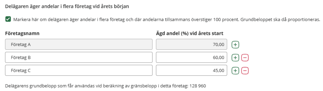 Markera om delägaren äger andelar i flera företag och det sammanlagda grundbeloppet annars skulle överstiga fyra inkomstbasbelopp. Då ska grundbeloppet fördelas mellan företagen i proportion till ägd andel.