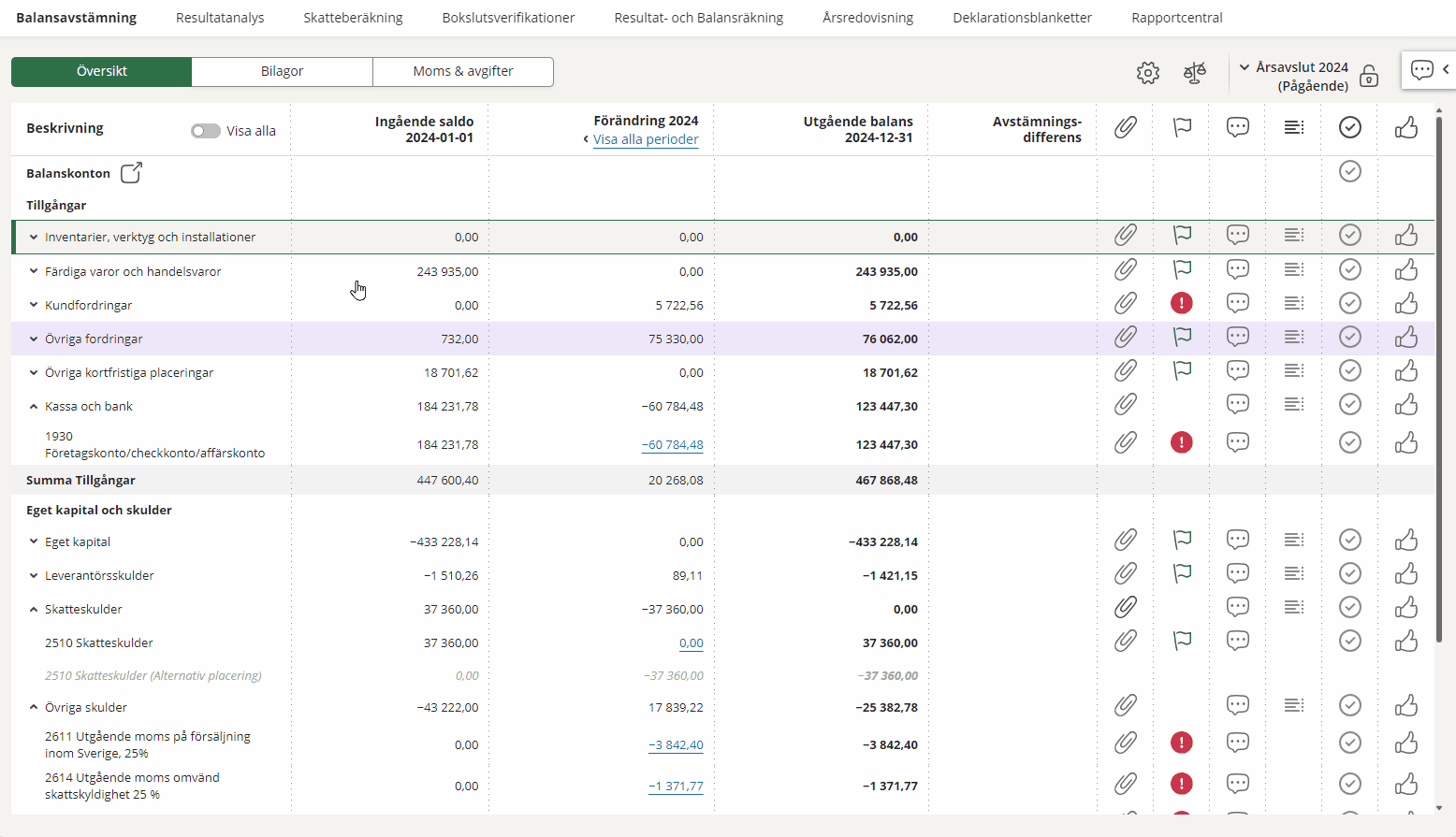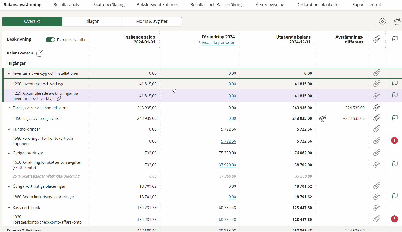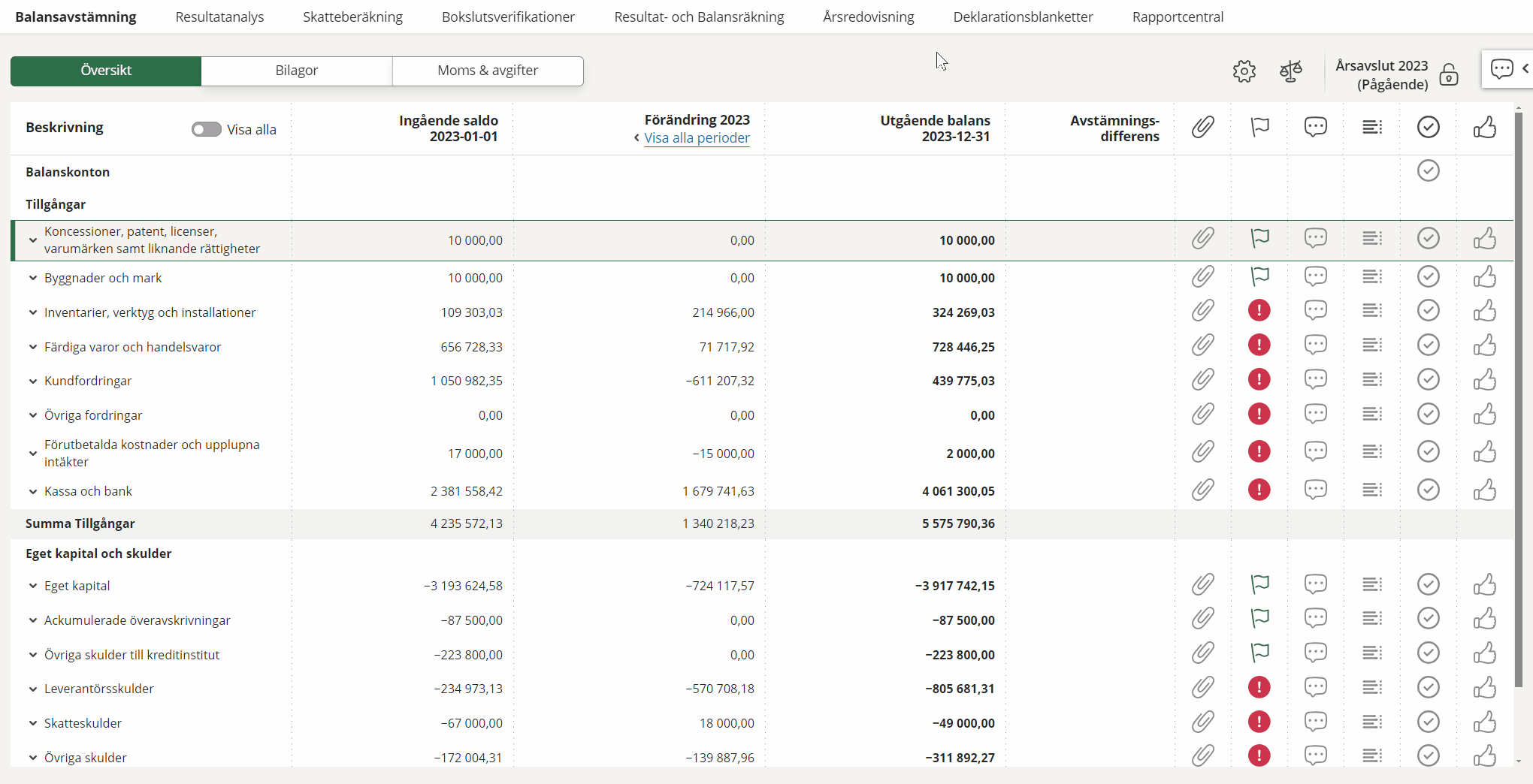 Visa bilagor i stället för konton i balansavstämningen och resultatanalysen