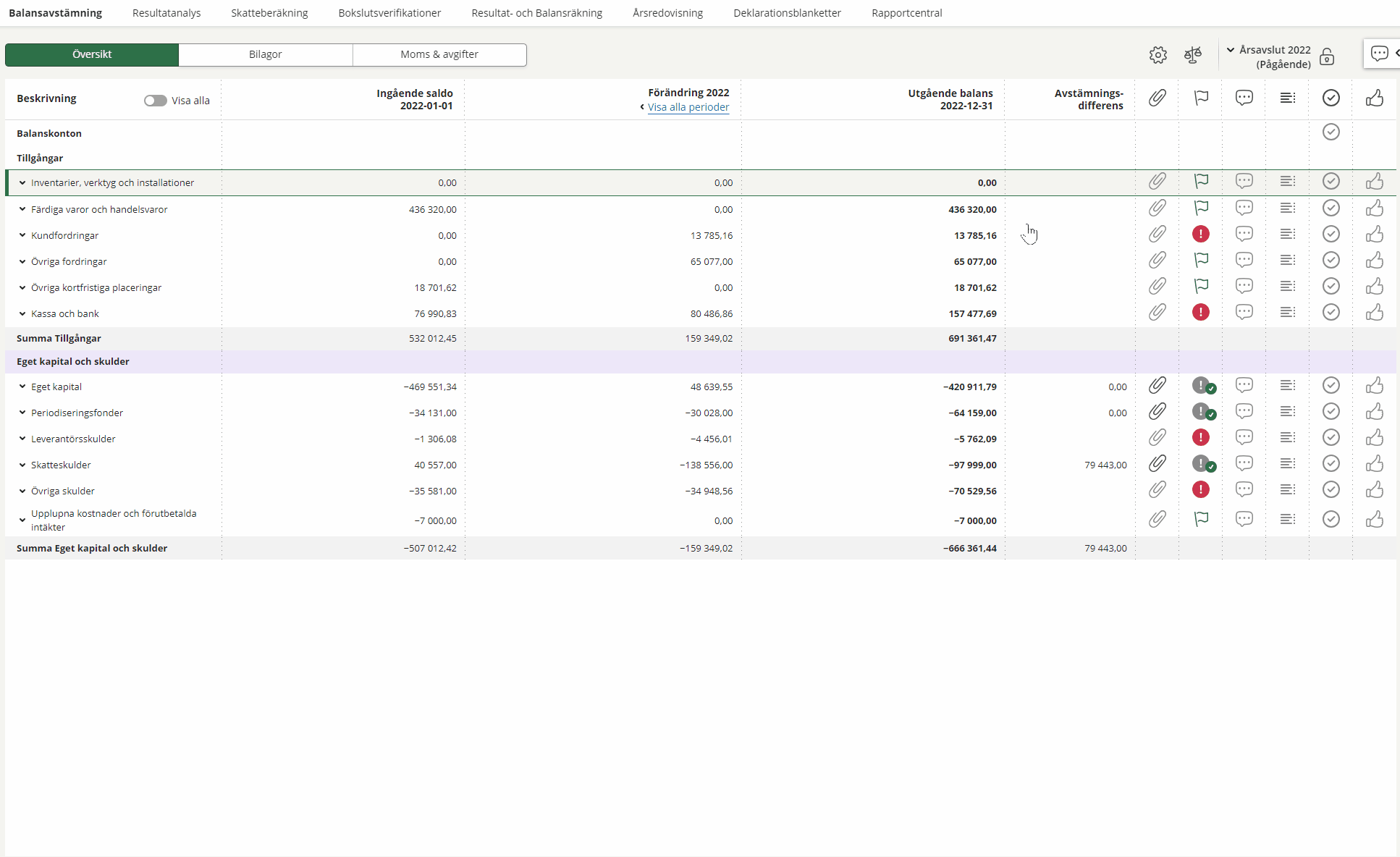 Vi har lagt till bilagorna Bokförda kostnader som inte ska dras av och Bokförda intäkter som inte ska tas upp under Årsavslut - Balansavstämning. Bilagorna skapas automatiskt när du väljer ett alternativ under Resultatplanering när det finns ifyllda värden för de kopplade kontona under Skatteberäkning.