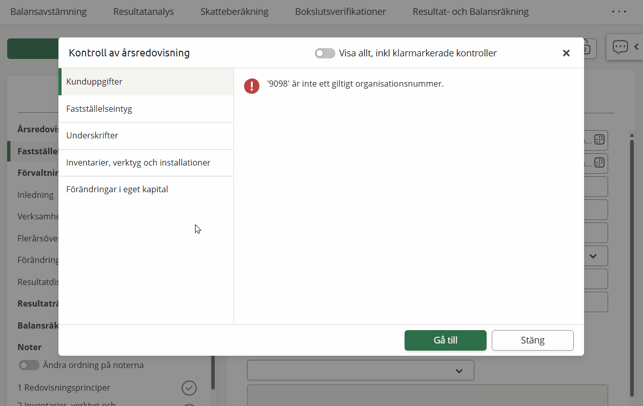 Nu kan du klarmarkera varningar i deklarations- och årsredovisningskontrollerna. Då kommer inte varningen att visas längre. För att visa klarmarkerade varningar, kan du slå på Visa allt, inkl klarmarkerade kontroller.