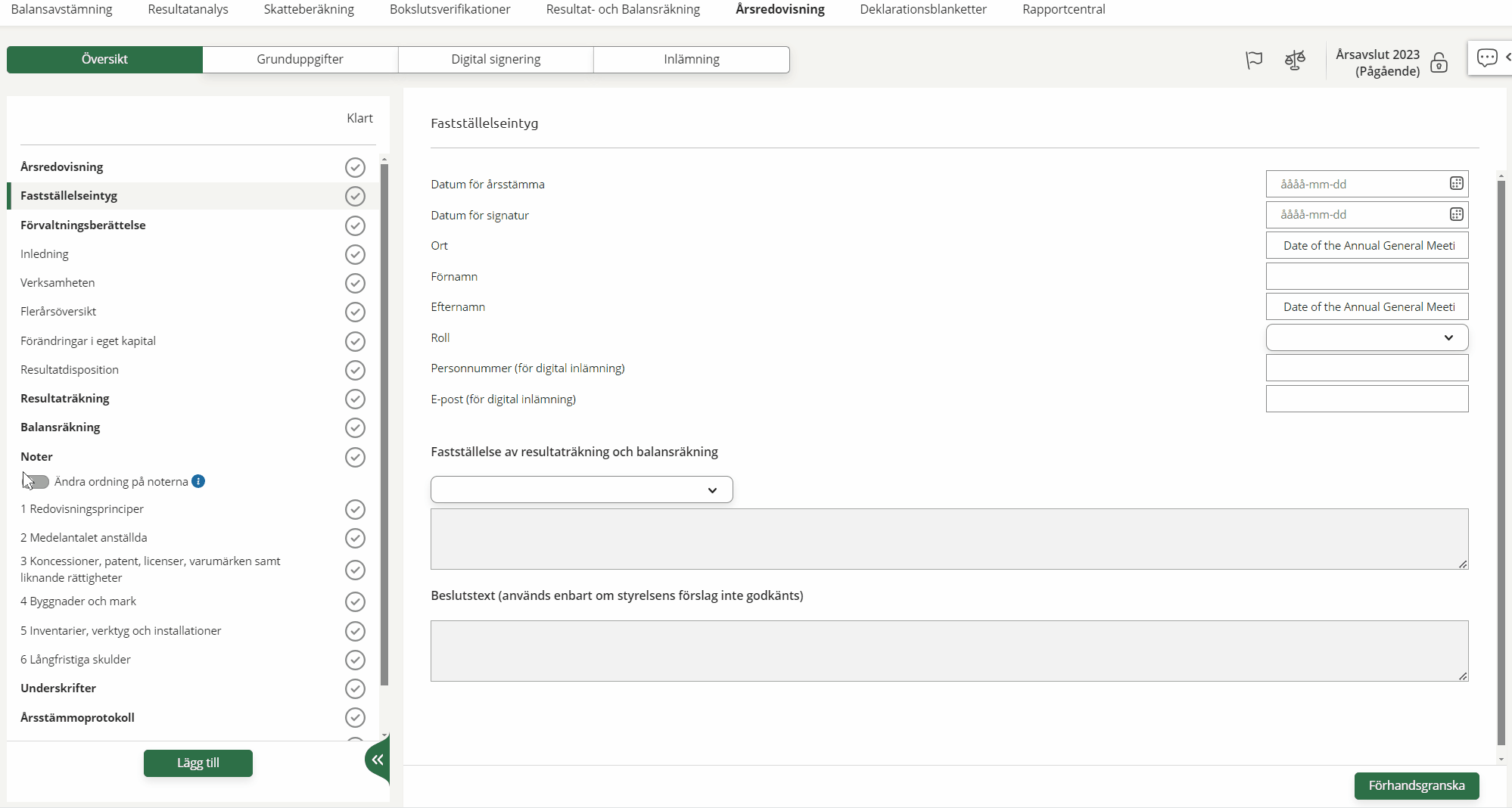 Texterna ersätter datumet när årsredovisningen skickas för signering via Signering. Du förhandsgranskar enkelt dokumentet med knappen Förhandsgranska på sidan Digital signering.