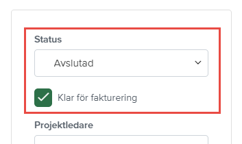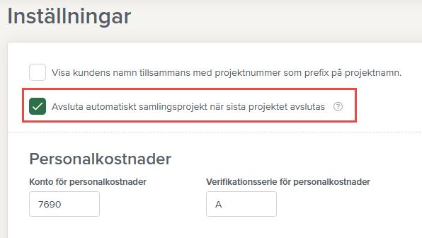 När den är makerad avslutas ett samlingsprojekt automatiskt när det sista underprojektet avslutas. Är inställningen inte markerad behåller samlingsprojektet sin nuvarande status även efter att det sista projektet har avslutats. Inställningen kan bara göras av den som är administratör.
