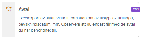 Rapporten Avtal (AV1) har tillkommit under Rapporter. Den visar information om avtalstyp, avtalslängd, bevakningsdatum m m. Det är endast de avtal som du har behörighet till som visas i rapporten.