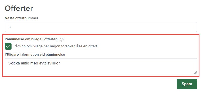 I fältet Ytterligare information vid påminnelse kan du lägga till information som du vill att användaren ska se i samband med påminnelsen. Det kan till exempel vara vilken typ av bilaga som ska bifogas till offerten.