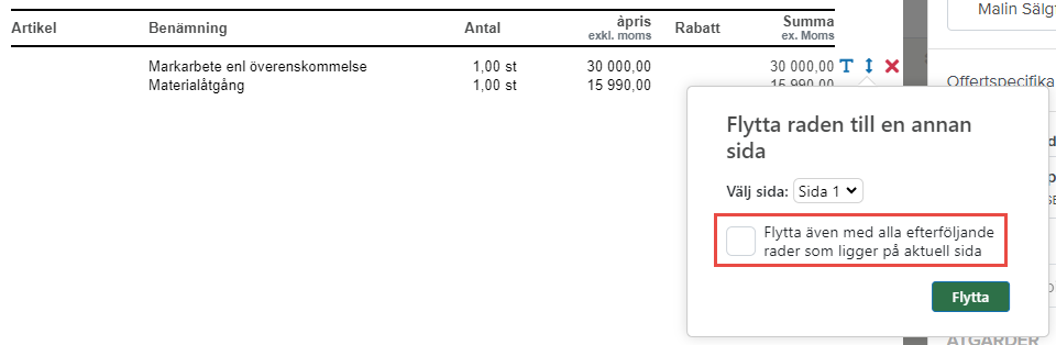 Om du vill flytta en artikelrad till en ny sida i offerten kan du nu välja om du vill att även de efterföljande raderna ska följa med. Tidigare har du bara kunnat flytta rad för rad.