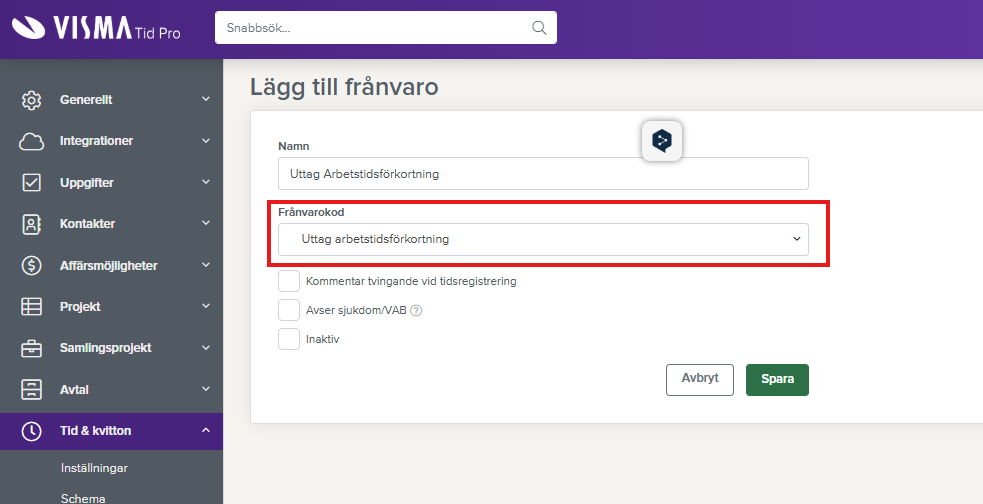Bilden visar frånvarokoden som behöver skapas i Tid & Projektplanering.