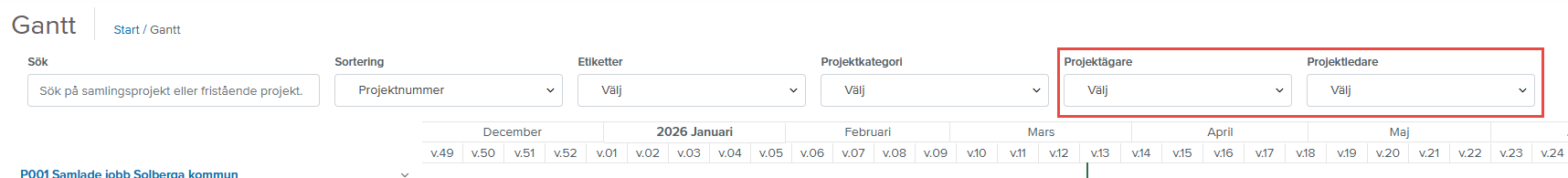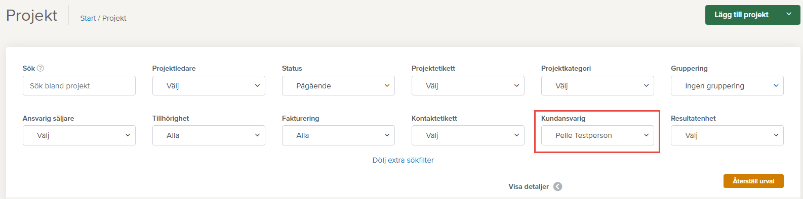 Har du saknat att kunna filtrera dina projekt på kundansvarig eller resultatenhet? Nu kan du det! Välj Projekt och klicka på Visa flera sökfilter så hittar du Kundanvarig och Resultatenhet som nya filter där.