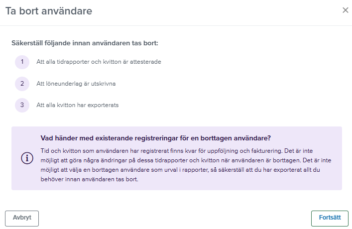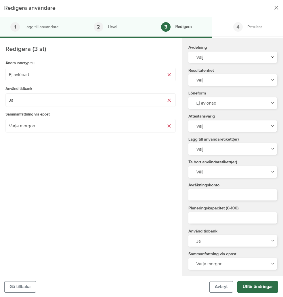 Nu kan du äntligen göra ändringar för flera användare på samma gång! Det kan till exempel vara bra om du behöver ändra attestansvarig, ändra avdelning eller resultatenhet. Du hittar funktionen under Inställningar - Generellt - Licenser & användare. Läs mer om i avsnittet Massuppdatera användare.