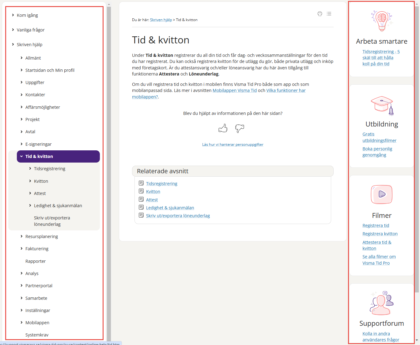 Valet Hjälp öppnar hjälpen i en ny flik i din webbläsare. Innehållet är precis detsamma som tidigare, men nu blir det enklare att navigera med innehållsförteckningen till vänster och du hittar relaterad information i boxarna till höger.