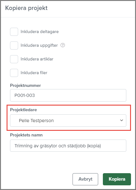 Välj projektledare vid kopiering av projekt