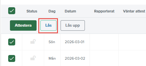 Nu kan du som administratör eller löneadministratör låsa andras dagar. Detta är till exempel användbart för dig som är löneadministratör och som rättar upp eventuella felregistreringar men inte är den som attesterar. Tidigare har du endast kunna låsa upp och attestera. Den nya knappen för detta heter Lås.
