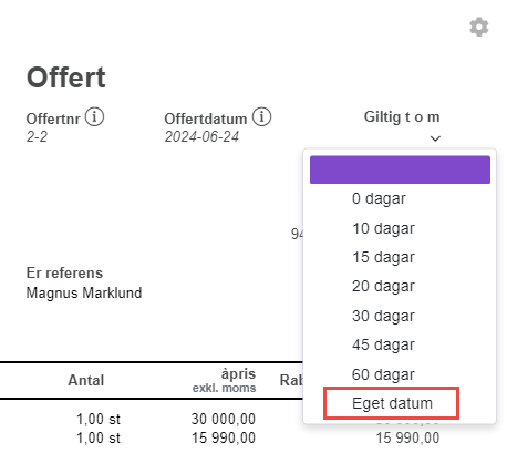 På en arbetskopia kan du välja hur länge en offert ska vara giltig efter att den är låst. Nytt nu är att du kan ange ett eget datum, om du inte vill använda de fördefinierade valen på 0 till 60 dagar.