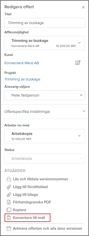 När du har offerter som du gillar och vill använda igen kan du enkelt skapa offertmallar. Klicka bara på Konvertera till mall under Redigera offert. Kanske vill du ha olika offertmallar för olika typer av jobb? Dina sparade offertmallar hittar du under Affärsmöjligheter - Offerter, fliken Mallar.
