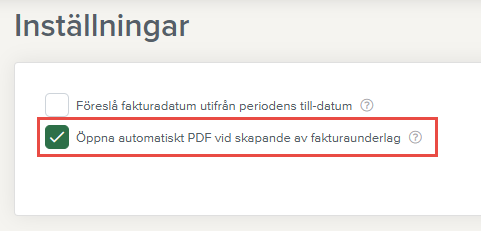 När detta är markerat öppnas pdf-filen automatiskt i ett nytt fönster när du skapar fakturaunderlaget. Inställningen kan bara göras av den som är administratör.