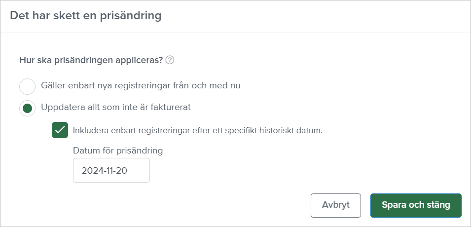 Från och med nu kan du som är administratör justera priset på tidsartiklar och på projekt från ett visst datum bakåt i tiden. Du kan välja om du vill uppdatera allt som inte är fakturerat och om du då ska inkludera registreringar som är gjorda efter det datumet. Prisjusteringen gör du under Inställningar - Artiklar & priser - Artiklar eller på filken Pris & fakturering under Projekt - Projekt.
